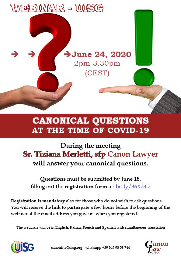 08Jun2020 Canonical questions at the time of Covid-19 News 6 Comments Canonical questions at the time of Covid-19 During the meeting Sr. Tiziana Merletti, sfp Canon Lawyer will answer your canonical questions. Registration
