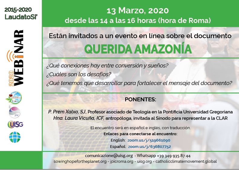 03Mar2020 Encuentro sobre Querida Amazonía Noticias 2 Comments Enlaces para conectarse al encuentro: English: zoom.us/j/519661090 Español: zoom.us/j/636807752