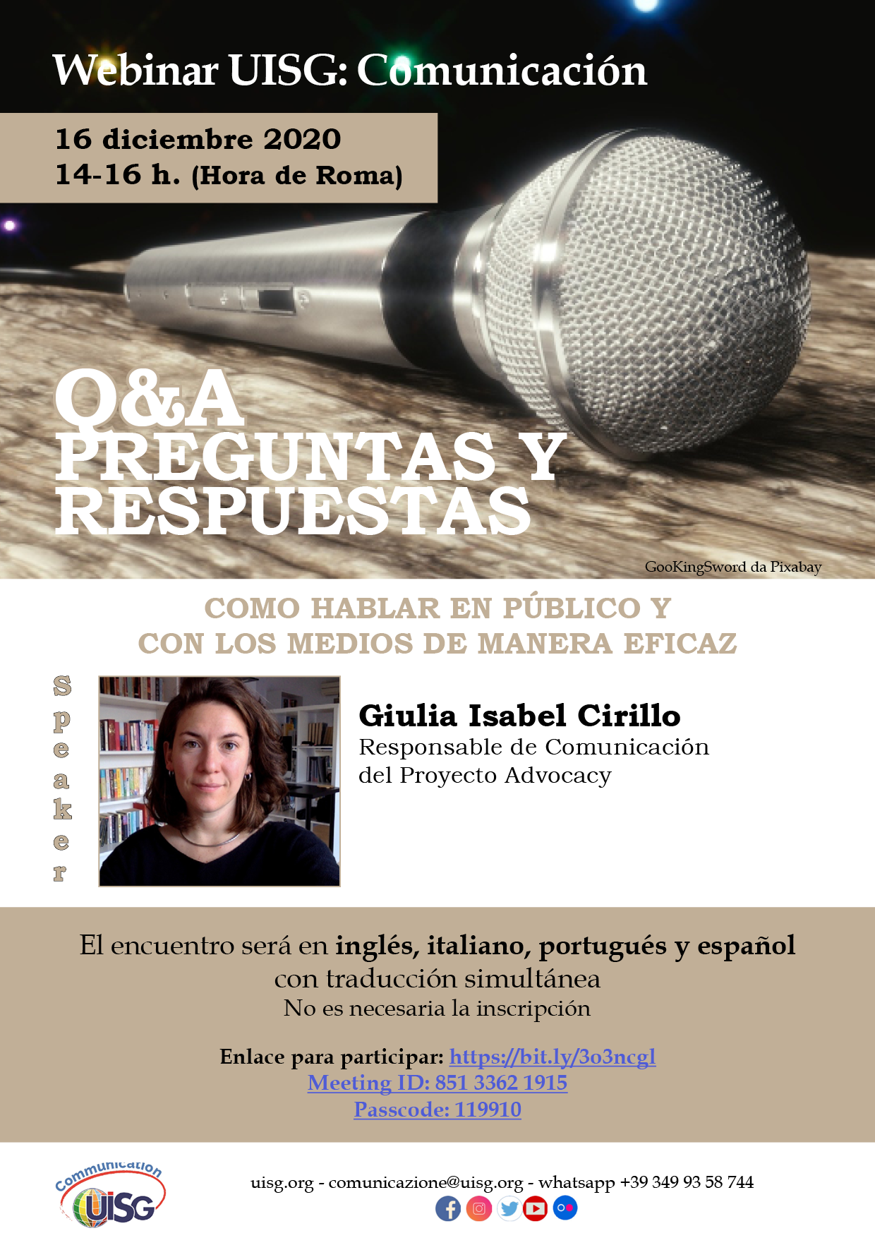 01Dec2020 Q&A: PREGUNTAS Y RESPUESTAS Noticias No Comments Webinar UISG: Comunicación Q&A: PREGUNTAS Y RESPUESTAS COMO HABLAR EN PÚBLICO Y CON LOS MEDIOS DE MANERA EFICAZ Enlace para participar: https://bit.ly/3o3ncgl Meeting ID: 851 3362 1915 Passcode: 119910