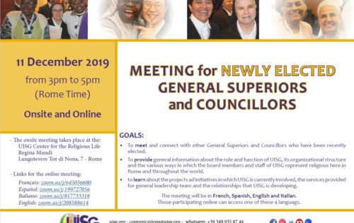 RENCONTRE POUR SUPÉRIEURES GÉNÉRALES ET CONSEILLÈRES GÉNÉRALES NOUVELLEMENT ÉLUES 11 décembre 2019 de 15h à 17h (Horaire de Rome) – La rencontre sur place aura lieur au: Centre UISG pour la Vie Religieuse Regina Mundi Lungotevere Tor di Nona, 7 – Rome – Liens pour se connecter en ligne: Français: zoom.us/j/645056680 Español: zoom.us/j/199727056 Italiano: zoom.us/j/817733318 English: zoom.us/j/208588614