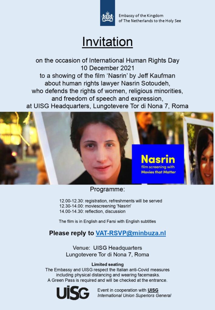 03Dec2021 Invitation to a screening of the film “Nasrin” Events No Comments Embassy of the Kingdom of the Netherlands to the Holy See in collaboration with the UISG invite to a screening of the movie “Nasrin” on Friday, December 10th 2021.