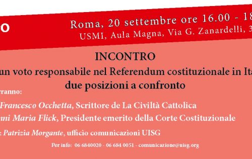 Care sorelle, vi scriviamo prima di un tempo di pausa delle nostre Unioni perché possiate mettere in agenda un incontro per il 20 settembre prossimo a Roma, che desideriamo proporvi congiuntamente, UISG e USMI, sul prossimo Referendum Costituzionale, al quale sono chiamate a rispondere tutte coloro che, in Italia, hanno i requisiti per il voto.Read more…