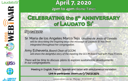 Celebrazione del quinto anniversario di Laudato Sii 7 aprile ore 14-16 (Ora di Roma GMP+2) Link per partecipare al webinar: zoom.us/j/142855791