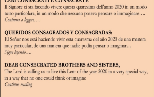 Roma, 23 marzo 2020 Alle Superiore Generali / Leader di Congregazioni Care Suore, Siamo molto grate per i tanti messaggi, espressioni di comunione di mente e cuore, che abbiamo ricevuto ieri, Giornata di Solidarietà e di Preghiera, che ha unito le congregazioni religiose femminili e maschili di tutto il mondo in questa comune iniziativa. ContinuiamoRead more…