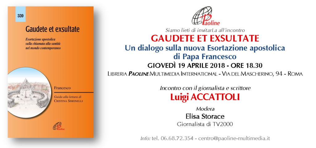 13Apr2018 GAUDETE ET EXSULTATE Dialogo sulla nuova Esortazione apostolica di Papa FRANCESCO Notizie No Comments Libreria Paoline Multimedia International GAUDETE ET EXSULTATE Dialogo sulla nuova Esortazione apostolica di Papa FRANCESCO