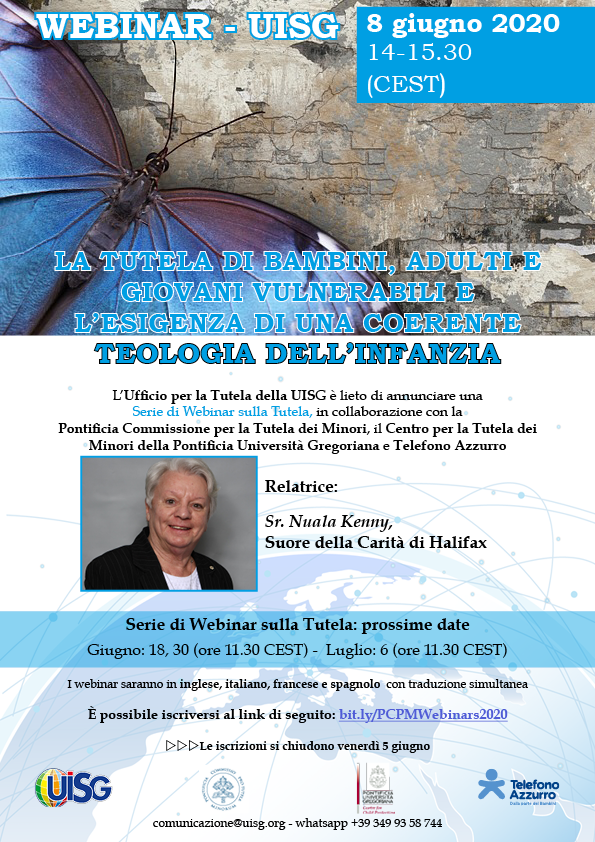 01Giu2020 La tutela: l’esigenza di una coerente teologia dell’infanzia Notizie No Comments La tutela di bambini, adulti e giovani vulnerabili e l’esigenza di una coerente teologia dell’infanzia 8 giugno 2020, 14-15.30 (CEST) L’Ufficio per la Tutela della UISG è lieto di annunciare una Serie di Webinar sulla Tutela, in collaborazione con la Pontificia Commissione per la Tutela dei Minori, il Centro per la Tutela dei Minori della Pontificia Università Gregoriana e Telefono Azzurro È possibile iscriversi (Le iscrizioni si chiudono venerdì 5 giugno) Scaricare l’invito qui