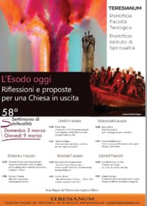 01Mar2017 L’Esodo oggi: riflessioni per una Chiesa in uscita Notizie No Comments La 58ª Settimana di Spiritualità si terrà presso la Pontificia Facoltà Teologica Teresianum, dal 5 al 9 marzo. L’argomento della Settimana è: L’Esodo oggi. Riflessioni e proposte per una Chiesa in uscita. Scarica il programma