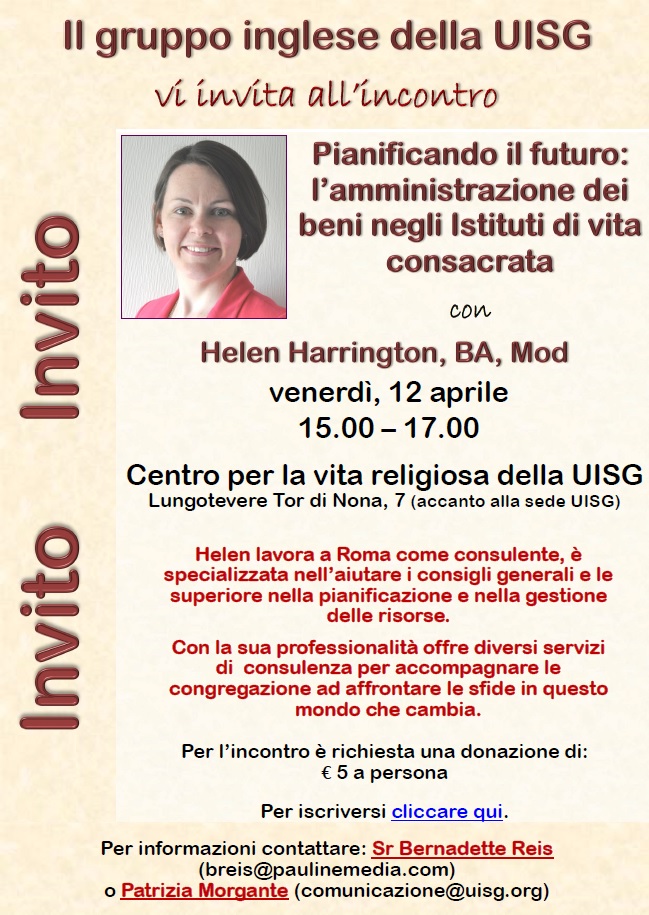 25Mar2019 Pianificando il futuro: l’amministrazione dei beni negli Istituti di vita consacrata Notizie No Comments #WebinarUISG #FormationUISG Pianificando il futuro: l’amministrazione dei beni negli Istituti di vita consacrata 12 aprile 2019 ore 15-17 L’incontro si svolge alla UISG ma si può anche seguire online: iscrizioni qui