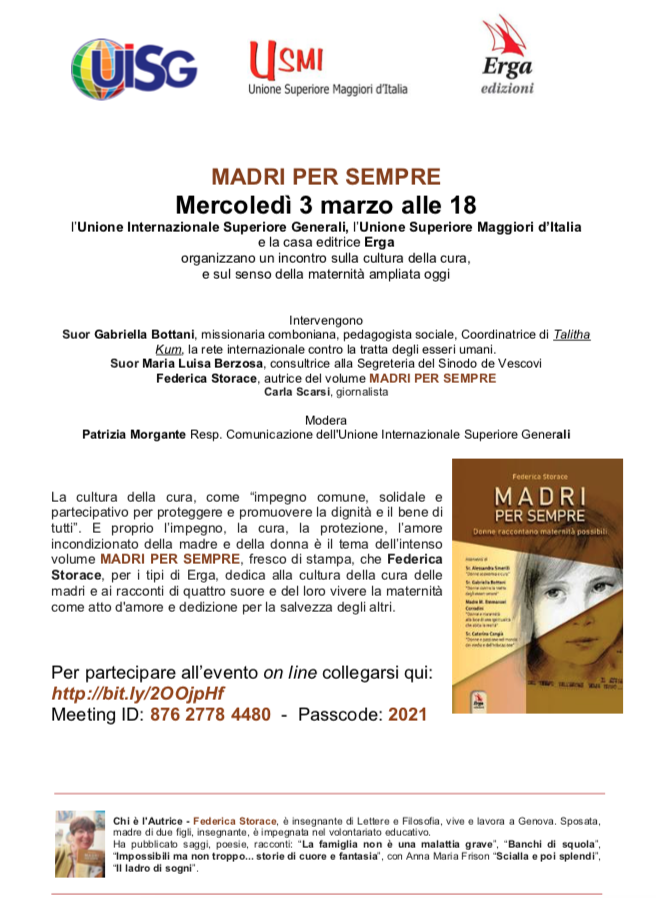 La cultura della cura, come “impegno comune, solidale e partecipativo per proteggere e promuovere la dignità e il bene di tutti”. E proprio l’impegno, la cura, la protezione, l’amore incondizionato della madre e della donna è il tema dell’intenso volume MADRI PER SEMPRE, fresco di stampa, che Federica Storace, per i tipi di Erga, dedica alla cultura della cura delle madri e ai racconti di quattro suore e del loro vivere la maternità come atto d’amore e dedizione per la salvezza degli altri.