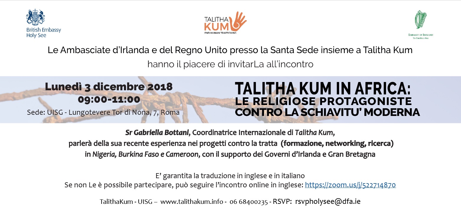 14Nov2018 TALITHA KUM IN AFRICA: LE RELIGIOSE PROTAGONISTE CONTRO LA SCHIAVITU’ MODERNA Notizie No Comments TALITHA KUM IN AFRICA: LE RELIGIOSE PROTAGONISTE CONTRO LA SCHIAVITU’ MODERNA (scaricare l’invito) Se non Le è possibile partecipare, può seguire l’incontro online in inglese: https://zoom.us/j/522714870
