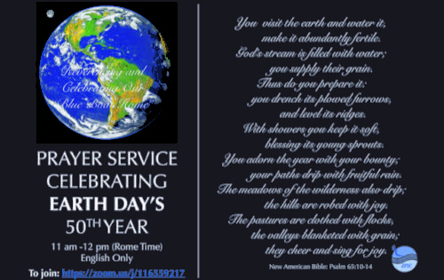 Earth Day’s 50 Anniversary: Prayer Service (English only) April 22nd at 11am Rome time Link to participate: zoom.us/j/116559217