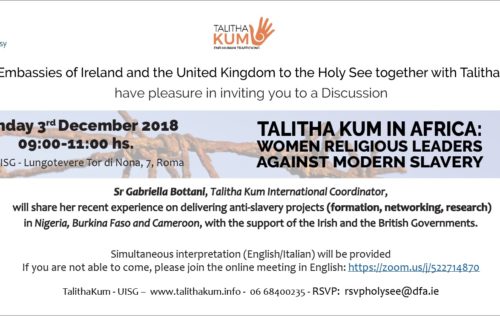 TALITHA KUM IN AFRICA: WOMEN RELIGIOUS LEADERS AGAINST MODERN SLAVERY (download the invitation) If you are not able to come, please join the online meeting in English: https://zoom.us/j/522714870