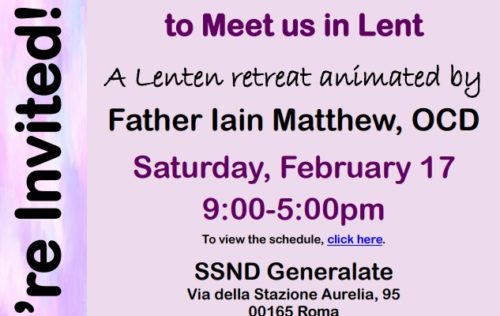 Lenten Retreat UISG English Speaking Group presents The Gift of the Risen Christ Who Comes to Meet us in Lent A Lenten retreat animated by Father Iain Matthew, OCD Saturday, February 17 9:00-5:00pm To view the schedule, click here SSND Generalate Via della Stazione Aurelia, 95 00165 Roma