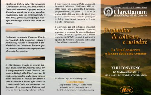 The Consecrated Life and the care of the common Home Summary of the conference (Claretianum, December 12-15, 2017) A Conference of the Claretianum, Insitute of Consecrated life, entitled “A garden to cultivate and preserve. The Consecrated Life and the care of the common home ” was held from 12 to 15 December 2017, has confronted usRead more…