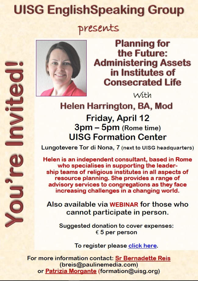 25Mar2019 Planning for the Future: Administering Assets in Institutes of Consecrated Life News No Comments #WebinarUISG #FormationUISG Planning for the Future: Administering Assets in Institutes of Consecrated Life April 11, 2019 – 3pm/5pm Meeting online and live: Register here