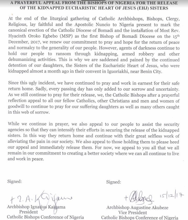 “From the heart, I unite myself to the appeal of the bishops of Nigeria for the liberation of the six Sisters of the Eucharistic Heart of Jesus, kidnapped roughly a month ago from the convent in Iguoriakhi,” the pontiff said, referring to the city in southern Nigeria where the sisters resided.