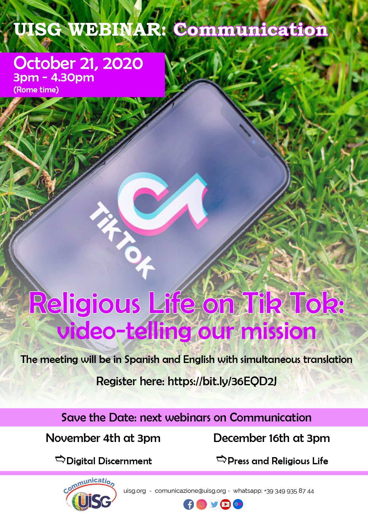 08Oct2020 Religious Life on Tik Tok: video-telling our mission News No Comments Webinar on Communications: Religious Life on Tik Tok: video-telling our mission October 21, 2020; 3pm – 4.30pm (Rome time) The meeting will be in Spanish and English with simultaneous translation Register here:
